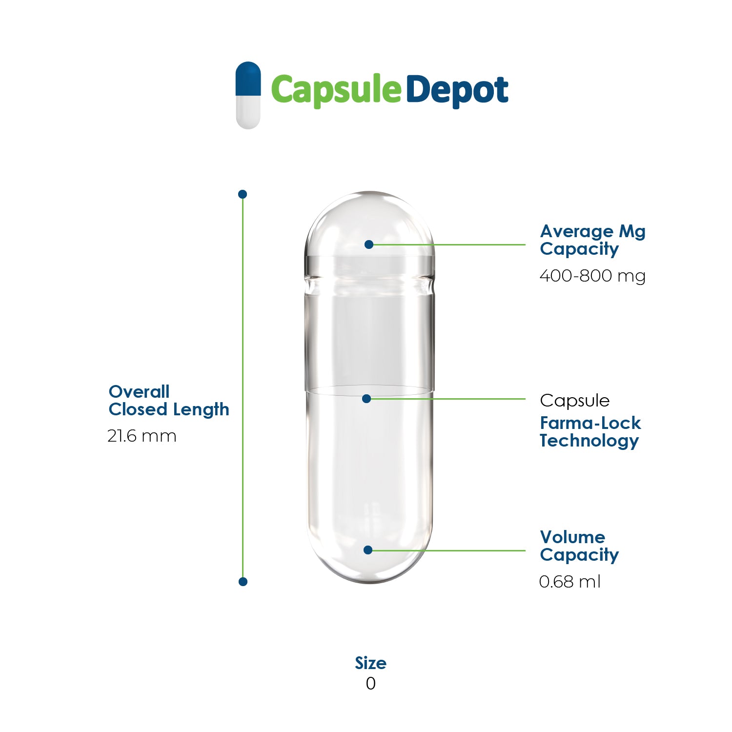 Capsule Depot Size 0 Clear Empty Vegetarian Capsules are designed to be easy to fill, whether you are filling them manually or using a capsule filling machine. The capsules have tough, unique lock technology rounded ends and are transparent, making it easy to see how much powder you are adding. The capsules can hold 408mg to 816mg of powdered supplements, depending on the density of the powder.