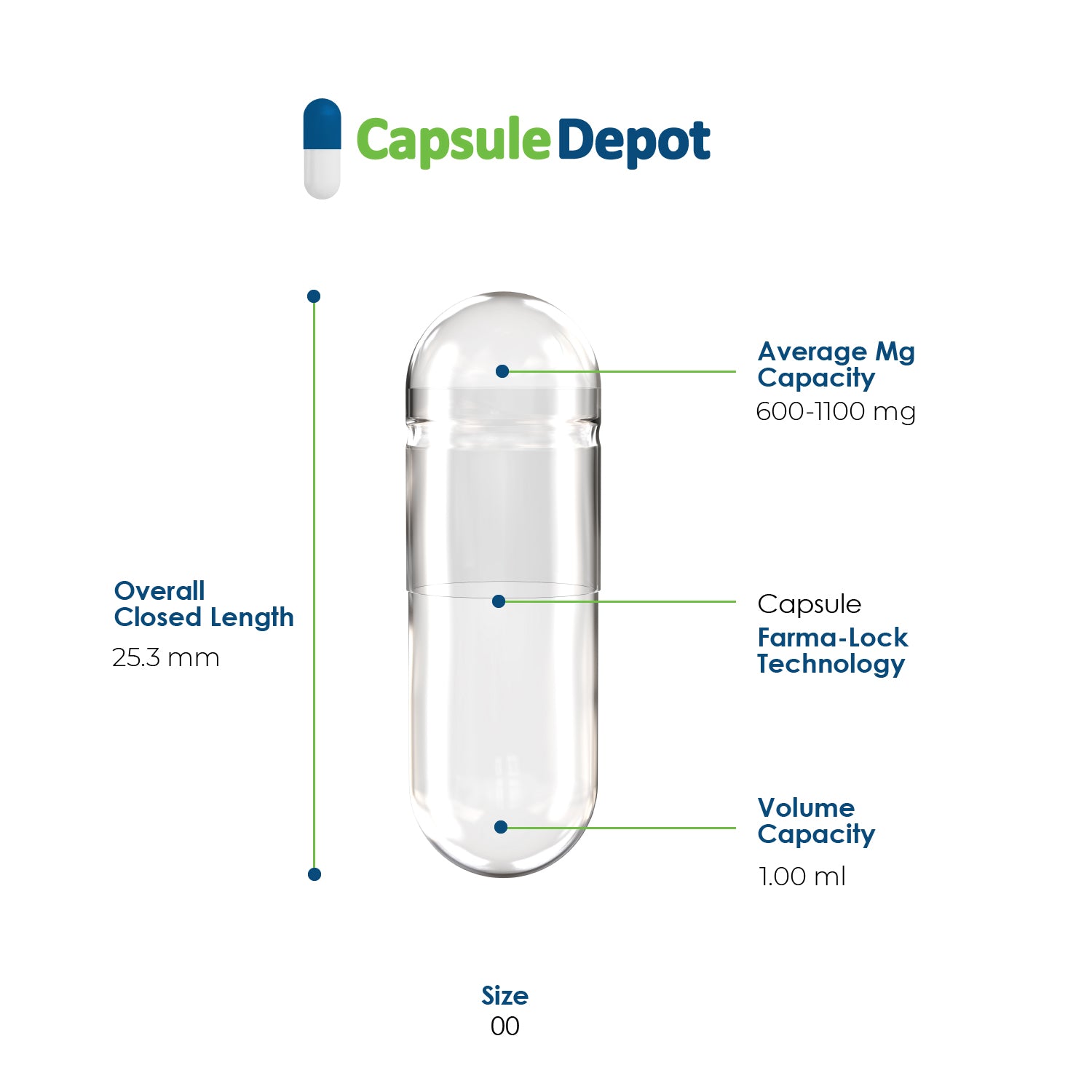 Capsule Depot Size 00 Clear Empty Gelatin Capsules are designed to be easy to fill, whether you are filling them manually or using a capsule filling machine. The capsules have tough, unique lock technology rounded ends and are transparent, making it easy to see how much powder you are adding. The capsules can hold 570mg to 1,140mg of powdered supplements, depending on the density of the powder.